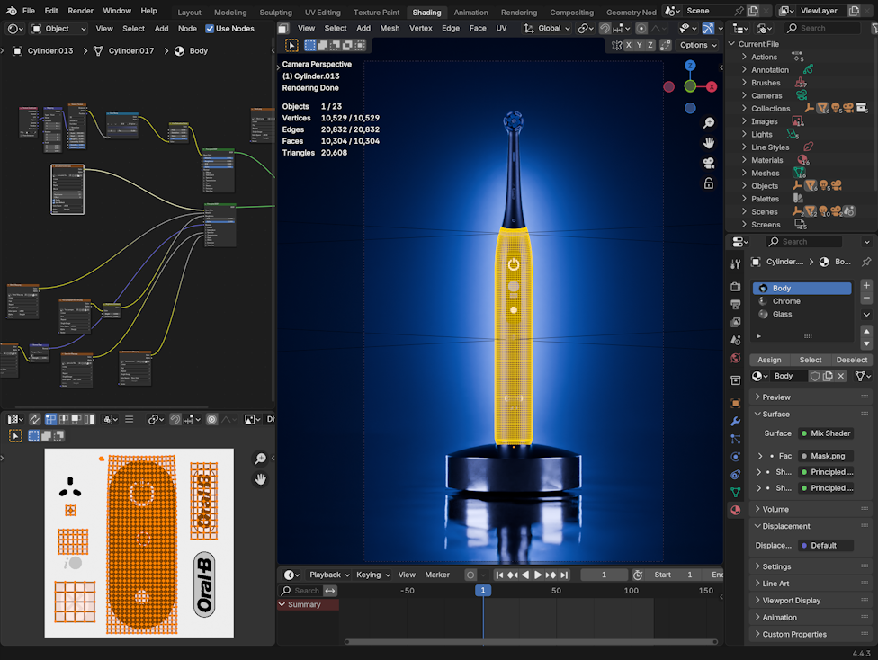 Learn to create a high quality 30-second product advertisement in Blender with a step-by-step guide to modeling, texturing, lighting, and animating and rendering a high-tech electric toothbrush.